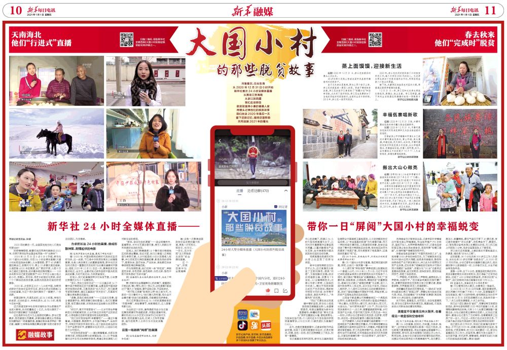 2020年12月31日0點(diǎn)0分0秒起,新華社26個(gè)國(guó)內(nèi)分社聯(lián)動(dòng),開啟24小時(shí)全媒體直播《大國(guó)小村的那些脫貧故事》。從白雪皚皚、零下40多攝氏度的黑龍江,到椰風(fēng)習(xí)習(xí)、零上10多攝氏度的海南,從海拔超4000米的高原,到廣袤的平原,從數(shù)十萬米之遙的衛(wèi)星視角,到纖毫畢現(xiàn)的特寫鏡頭……100余名新華社記者走進(jìn)散落于960萬平方公里土地上的小村,用鏡頭、用對(duì)話、用老鄉(xiāng)的皺紋與笑容,講述一個(gè)個(gè)鮮活的脫貧故事,繪就決戰(zhàn)脫貧攻堅(jiān)的恢宏畫卷。