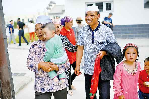 ▲馬幫林(右二)與老伴帶著孫子踏進(jìn)潤(rùn)豐村新家(2017年8月17日攝)。