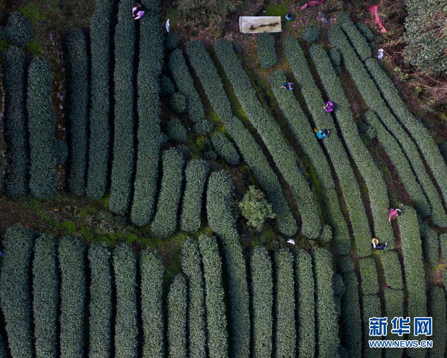 3月12日,在位于杭州市西湖風(fēng)景名勝區(qū)滿覺隴村白鶴峰的西湖龍井茶葉基地,茶農(nóng)在采摘西湖龍井頭茶(無人機(jī)照片)。