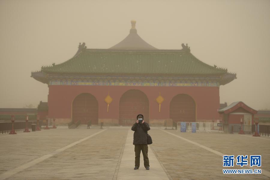 3月15日,市民在北京天壇公園里拍照。當(dāng)日,我國北方多地出現(xiàn)沙塵天氣。新華社記者 彭子洋 攝
