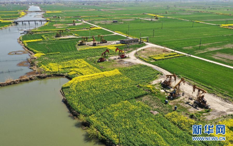 3月23日,在江蘇油田陳堡采油班站,采油機組在工作中(無人機照片)。