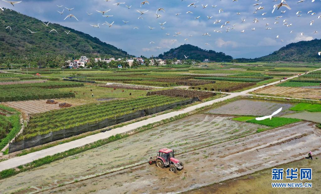 4月5日,海南省陵水黎族自治縣光坡鎮(zhèn)的農(nóng)民在田間勞作(無人機照片)。