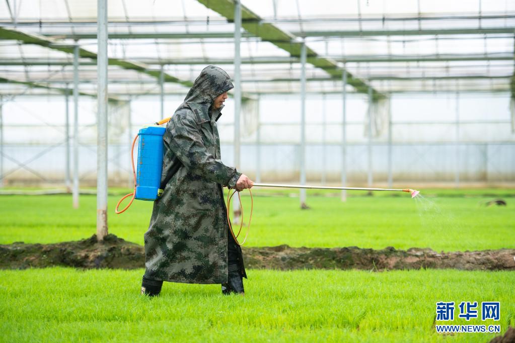 4月5日,在湖南省瀏陽(yáng)市龍伏鎮(zhèn)鼎鈞種養(yǎng)專(zhuān)業(yè)合作聯(lián)合社水稻育秧工廠(chǎng),工作人員給秧苗施肥。