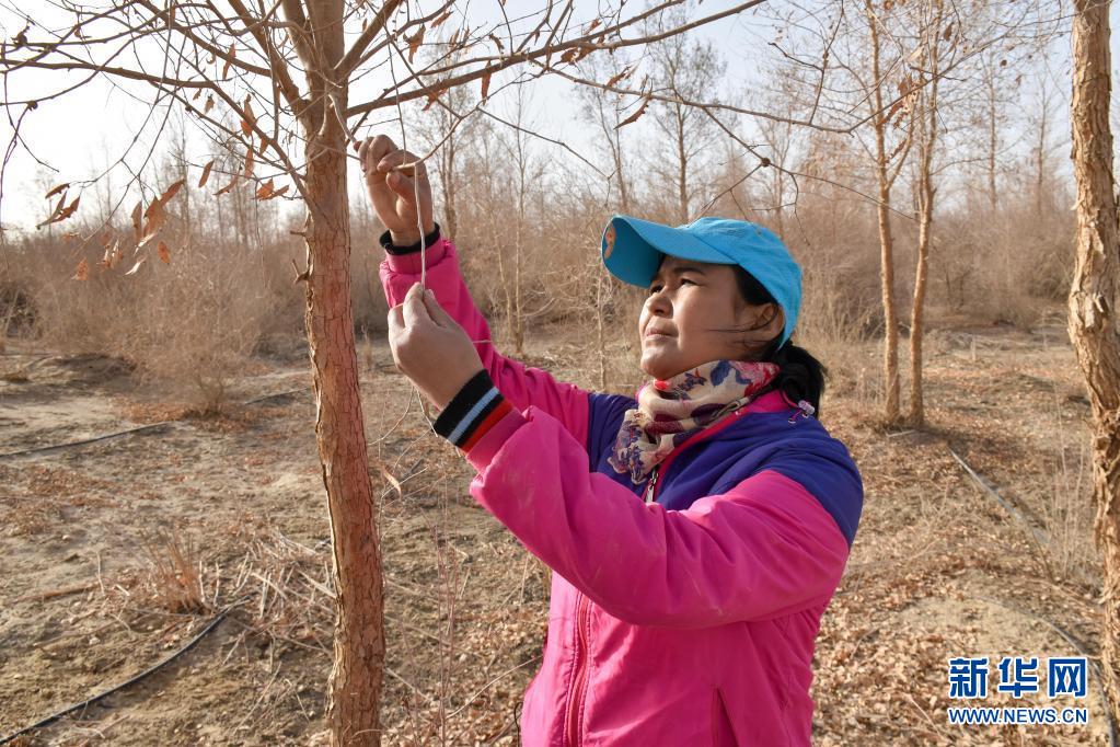 邊種樹、邊研究,帕提古麗和同事實踐了滴灌節(jié)水技術(shù)、草方格固定、栽植抗旱樹種、防沙林綁草護苗……沙漠里的樹木成活率不斷提升,生態(tài)環(huán)境不斷變好。