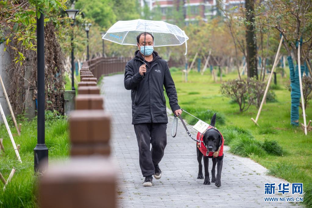 吳虎剛今年45歲,和同是盲人的妻子經(jīng)營(yíng)著一家盲人推拿診所。每天上班,導(dǎo)盲犬“C羅”都會(huì)陪伴吳虎剛從家走到診所(4月11日攝)?! ⌒氯A社發(fā) (張夢(mèng) 攝)
