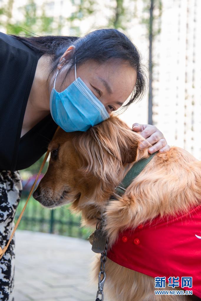 生活在南京市建鄴區(qū)的陳冬梅與導盲犬“果凍”在一起(4月4日攝)。 新華社發(fā) (張夢 攝)