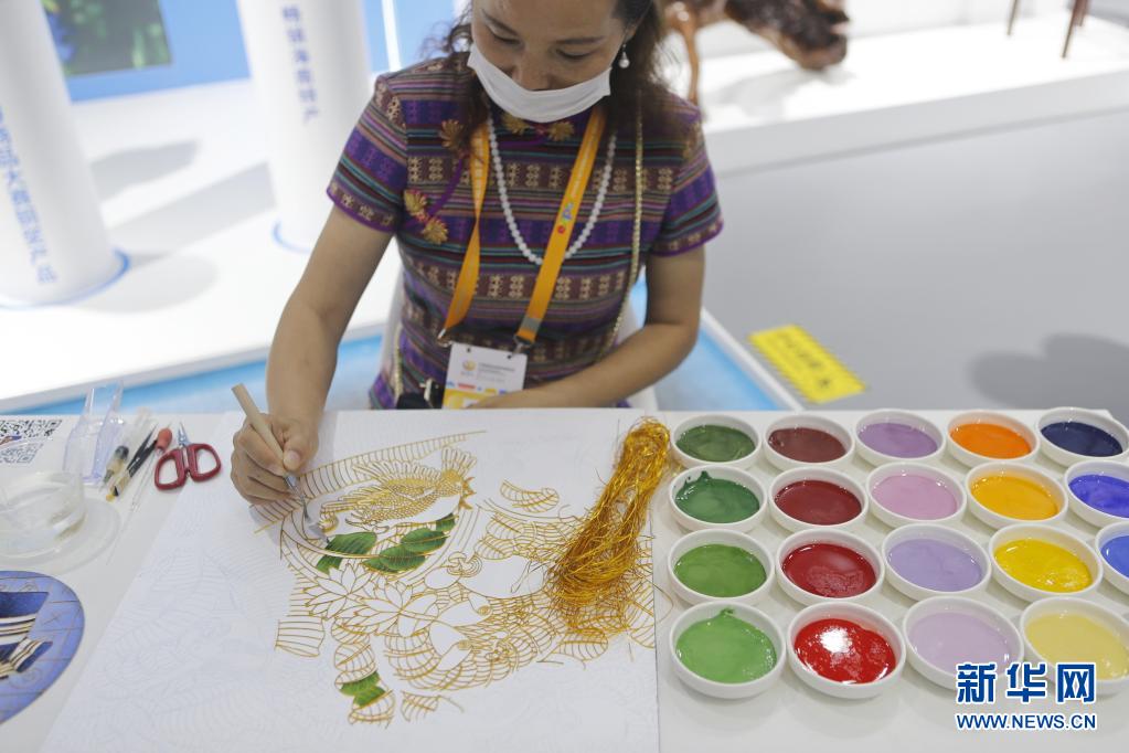 5月8日,一名參展商在消博會(huì)現(xiàn)場(chǎng)制作景泰藍(lán)畫(huà)。新華社記者 丁洪法 攝