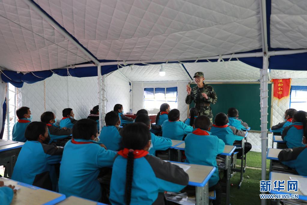 5月24日,武警青??傟?duì)果洛支隊(duì)機(jī)動(dòng)大隊(duì)排長(zhǎng)張國(guó)睿為花石峽鎮(zhèn)藏文中心寄宿制小學(xué)的孩子上課。新華社記者 劉新 攝