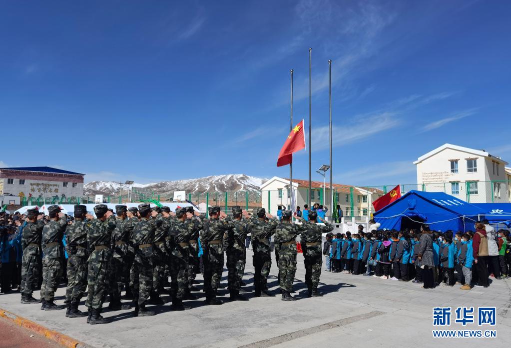 5月24日,武警青??傟牴逯ш牂C動大隊官兵與花石峽鎮(zhèn)藏文中心寄宿制小學(xué)的師生一同參加升國旗儀式。新華社發(fā)(宦爵才郎 攝)