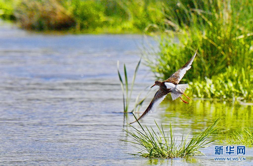 初夏,紅腳鷸在位于西藏拉薩的拉魯濕地國家級自然保護區(qū)內起舞覓食。