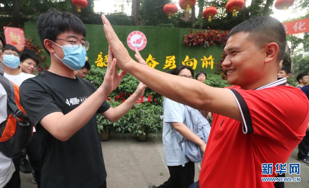 6月9日,在湖南省婁底市第二中學(xué)考點,走出考場的老大李慶國和班主任宋老師擊掌。