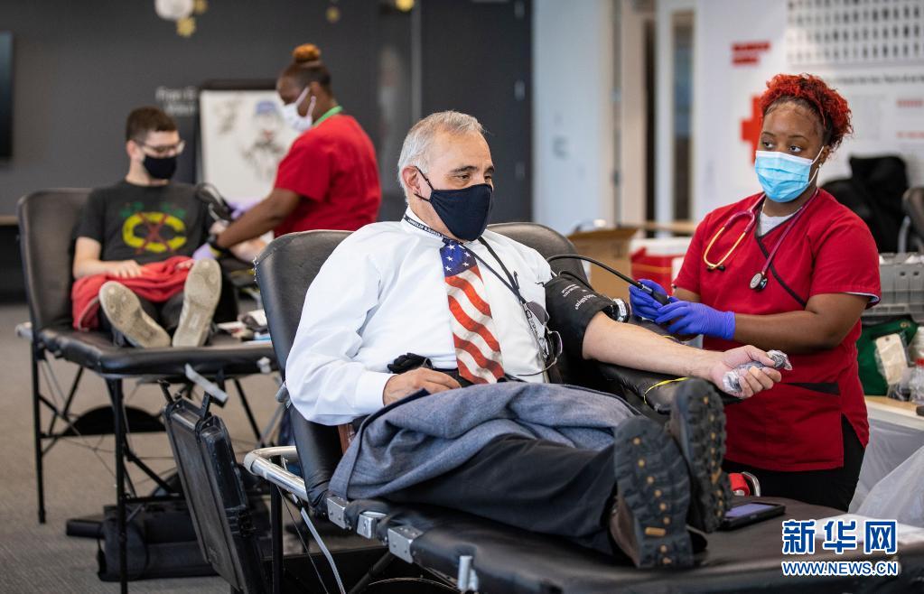 6月14日,在美國芝加哥,兩名獻血志愿者在大芝加哥地區(qū)紅十字會一獻血站內(nèi)測量血壓。新華社發(fā)(喬爾·萊納攝)