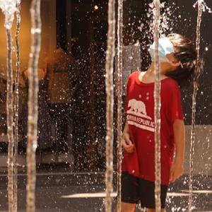 6月16日,美國加利福尼亞州洛杉磯市民在噴泉旁戲水納涼。加州南部本周迎來今年的首次高溫天氣。