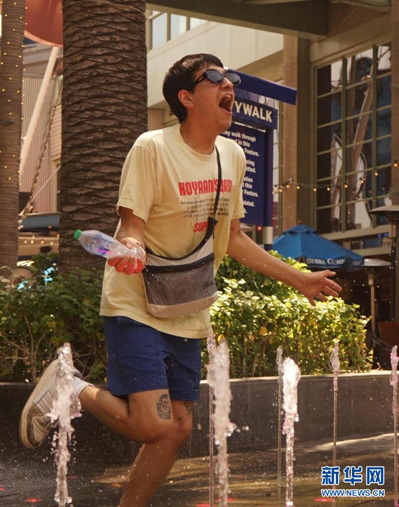 6月16日,美國加利福尼亞州洛杉磯市民在噴泉旁戲水納涼。加州南部本周迎來今年的首次高溫天氣。