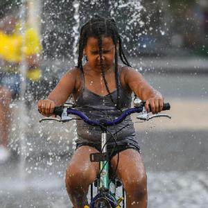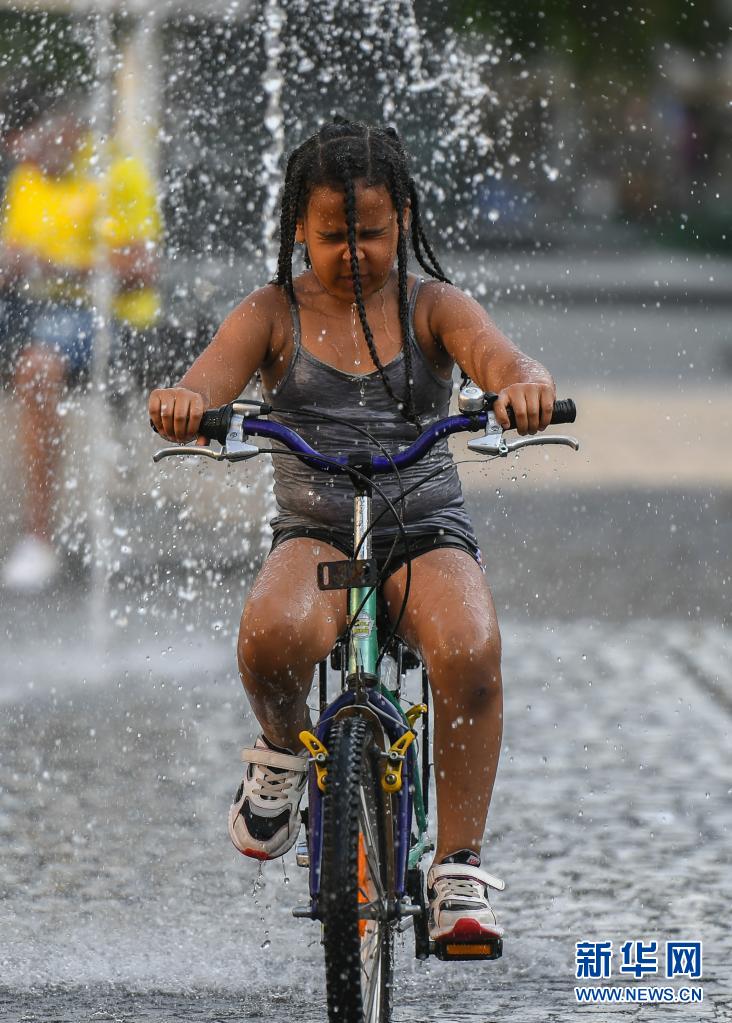 6月17日,在德國法蘭克福,一名小朋友騎車穿過噴泉納涼。