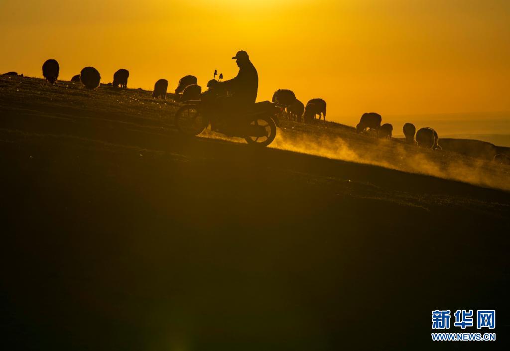 牧歸時(shí)分,在新疆裕民縣巴爾魯克山區(qū)夏牧場(chǎng)上,一名牧民騎著摩托車“收攏”羊群(6月15日攝)。
