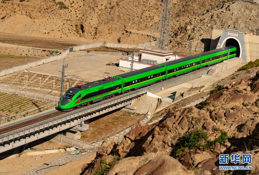 試運(yùn)行的復(fù)興號列車駛出拉林鐵路的嘎拉山隧道(6月16日攝)。