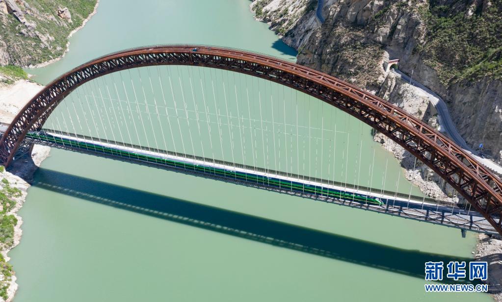 試運(yùn)行的復(fù)興號列車行駛在藏木特大橋上(6月17日攝,無人機(jī)照片)。
