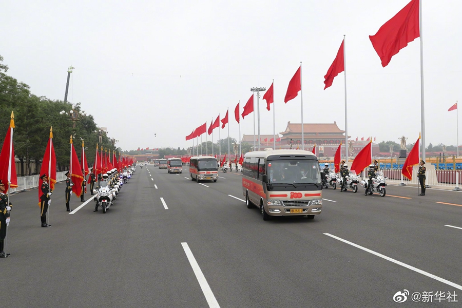 29日上午,“七一勛章”獲得者集體乘坐禮賓車從住地出發(fā),由國(guó)賓護(hù)衛(wèi)隊(duì)護(hù)衛(wèi)前往人民大會(huì)堂。