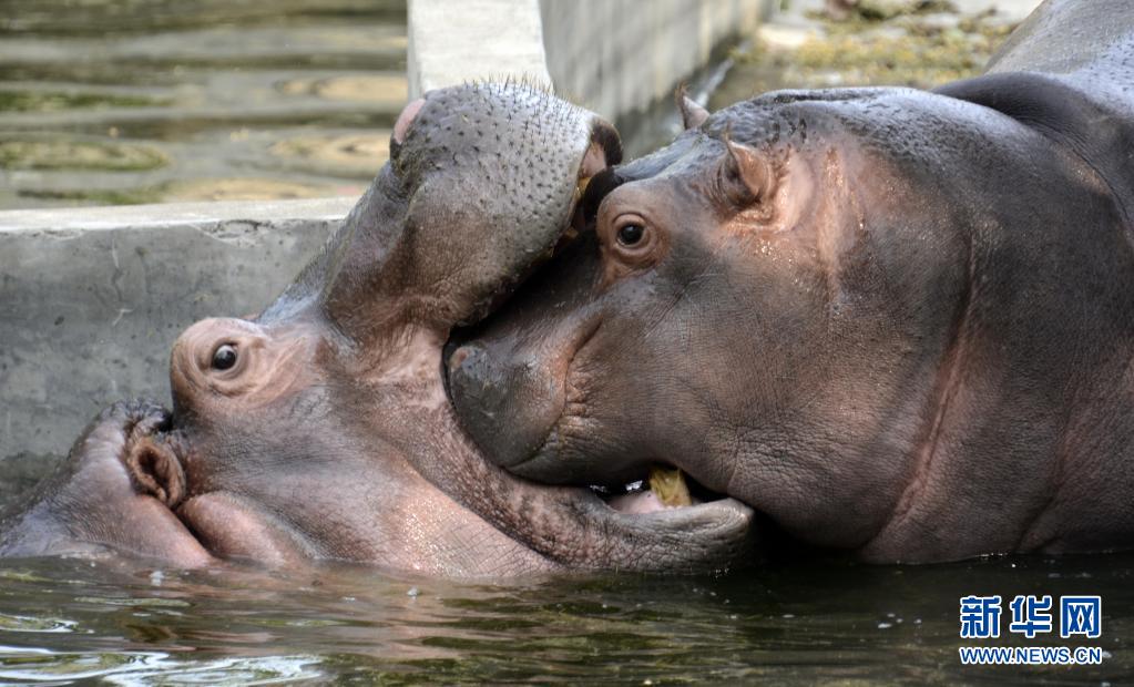 北京動物園河馬館內(nèi)的河馬在嬉戲(6月28日攝)。