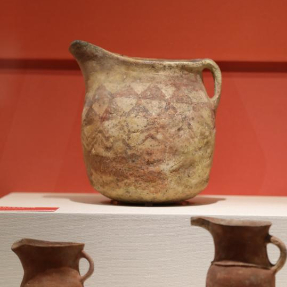 到了展厅后段,彩陶图案显得更加简练。几何形纹成为主调,有的杯、罐上只留下寥寥几笔,但器型更加多元——带单耳的陶豆、带流的陶罐相继出现,线条中隐约可见草原文化的影子。