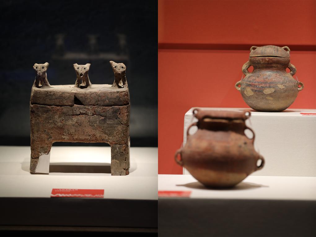 这是一张拼版照片:左图为新石器时代四坝文化的三犬钮盖彩陶方鼎,右图为新石器时代四坝文化的折线三角纹带盖六耳彩陶罐。新华社记者 张智敏 摄