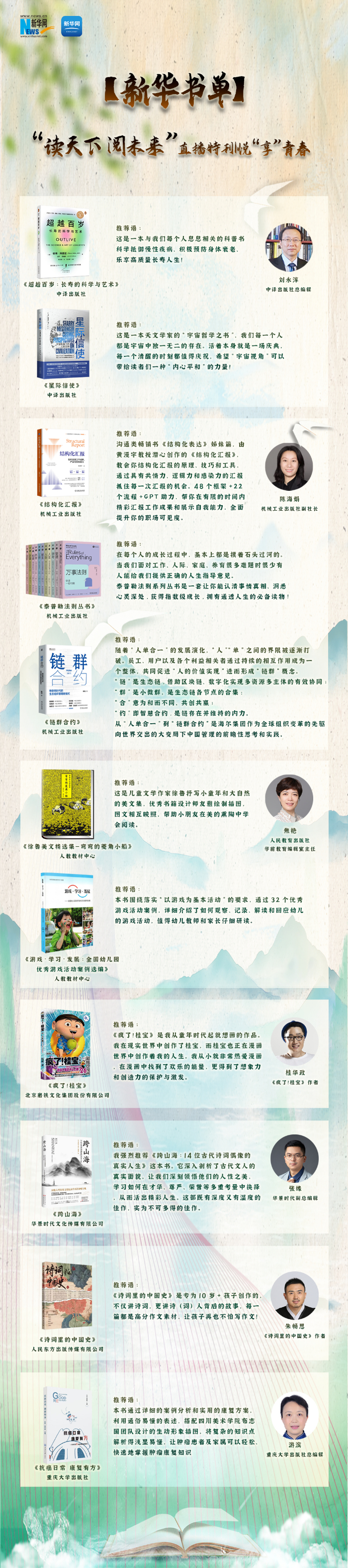 4·23世界读书日到来之际,新华网悦读频道联合中国传媒大学播音主持艺术学院推出荐书直播,邀请图书作者、出版社社长和总编辑围绕“悦”享青春这一主题,与中国传媒大学的同学们聊读书,本期书单为直播中各位嘉宾推荐的好书。