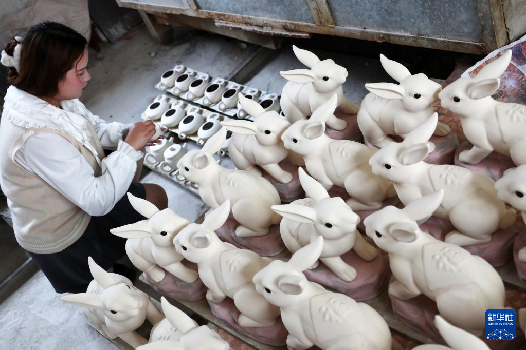 4月12日,在禹州市神垕古镇一家钧瓷企业,一位员工为素烧钧瓷做准备。