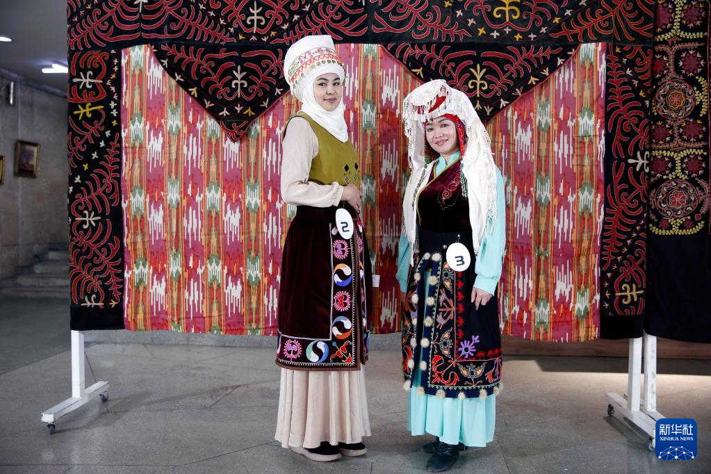 4月15日,在吉尔吉斯斯坦首都比什凯克,两名女子展示吉尔吉斯斯坦传统服饰。