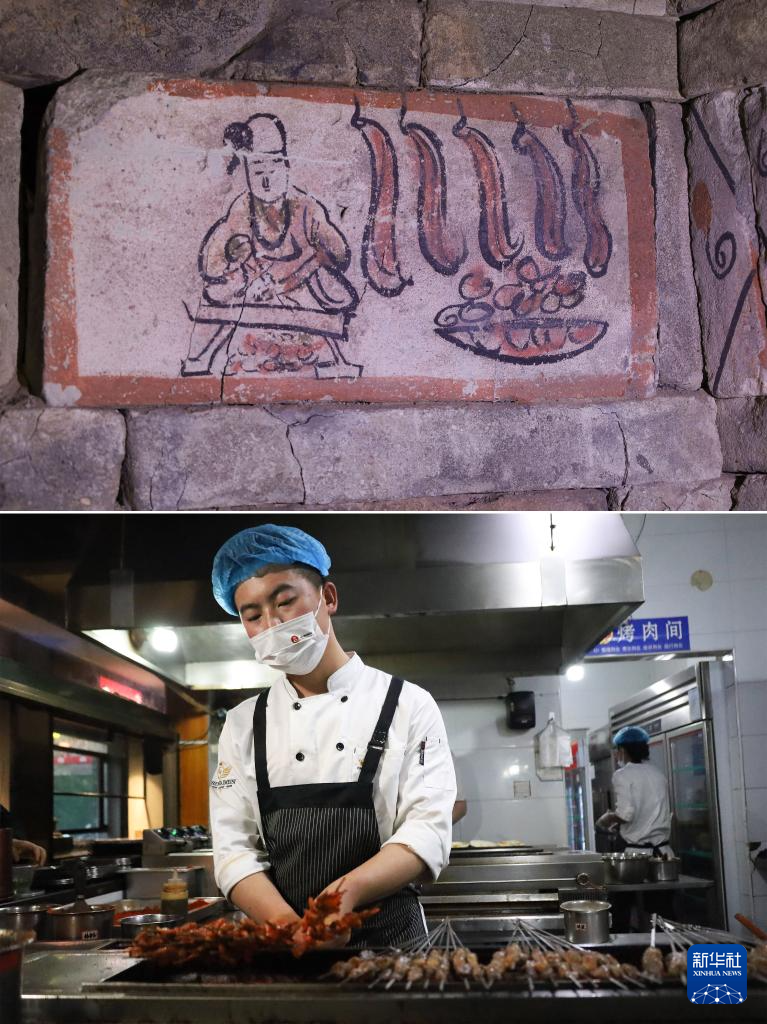 拼版照片:上图为嘉峪关魏晋墓六号墓的画像砖展现厨师在案前持刀剔肉、旁边的火盆正在烤肉的场景(5月13日摄);下图为嘉峪关市一家烤肉店的厨师正在烤肉(5月12日摄)。