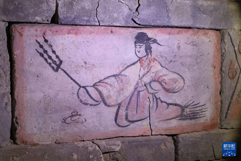 在嘉峪关魏晋墓六号墓的画像砖上,一侍女手持三股叉串好的烤肉(5月13日摄)。