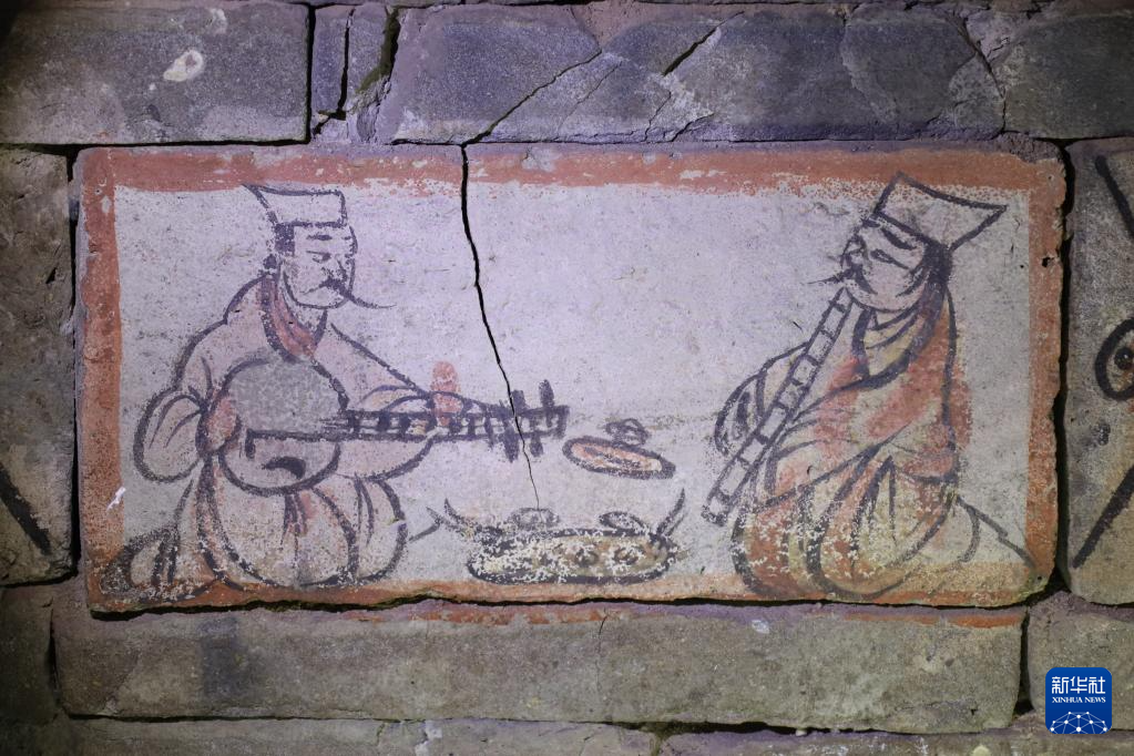 在嘉峪关魏晋墓六号墓的画像砖上,绘有墓主人宴请宾客时乐师用阮弦琵琶(左)和尺八长笛奏乐的场景(5月10日摄)。