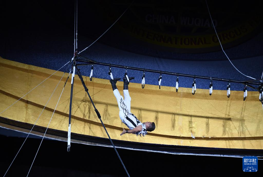 10月25日,巴西杂技演员在表演《秋千倒立》。