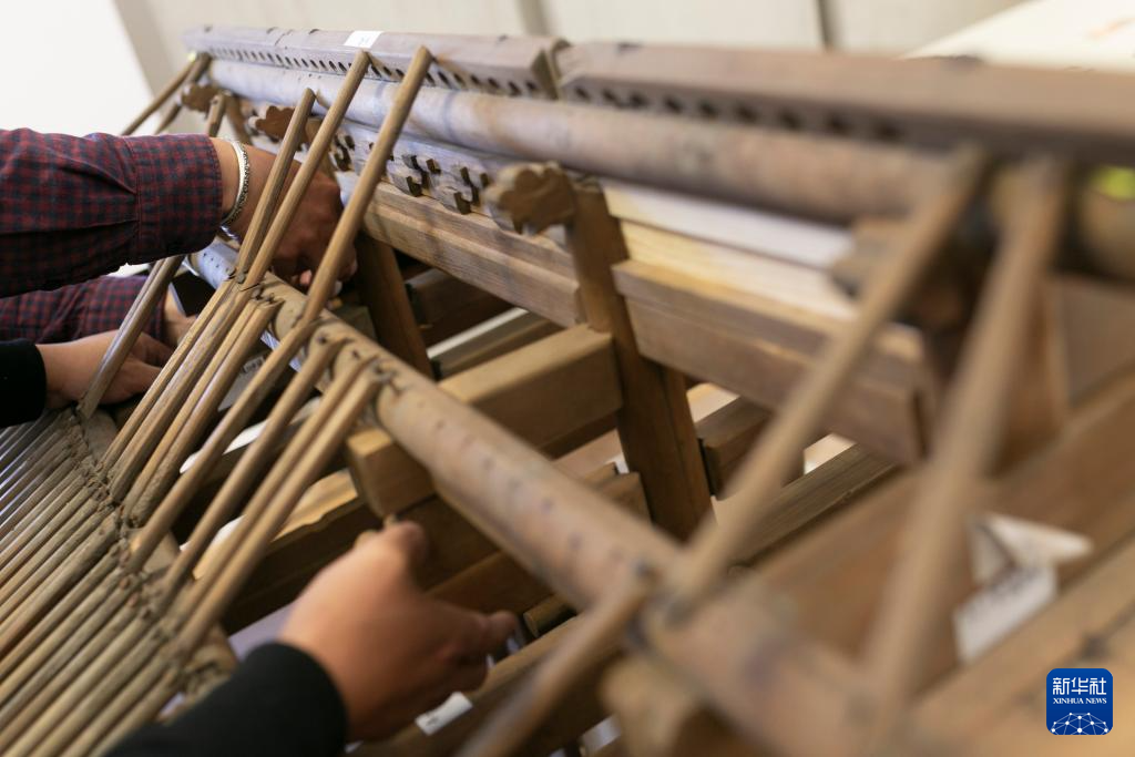10月16日,在斯洛文尼亚卢布尔雅那的民族志博物馆,故宫博物院专家鲍杰(左)和史孙明修复中国古建筑木质大门模型。