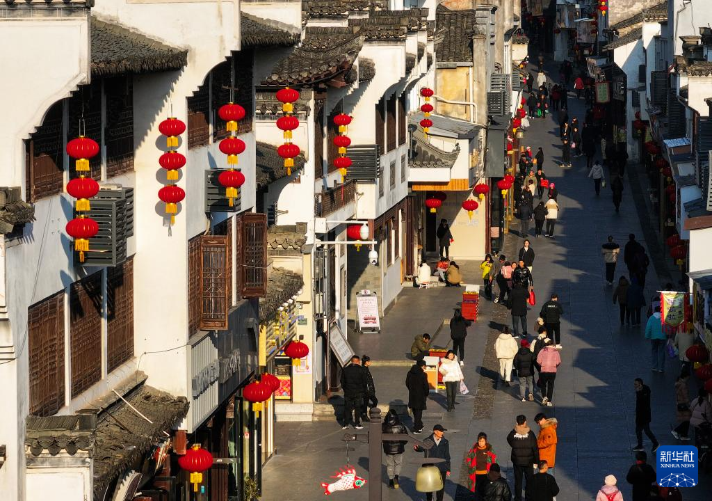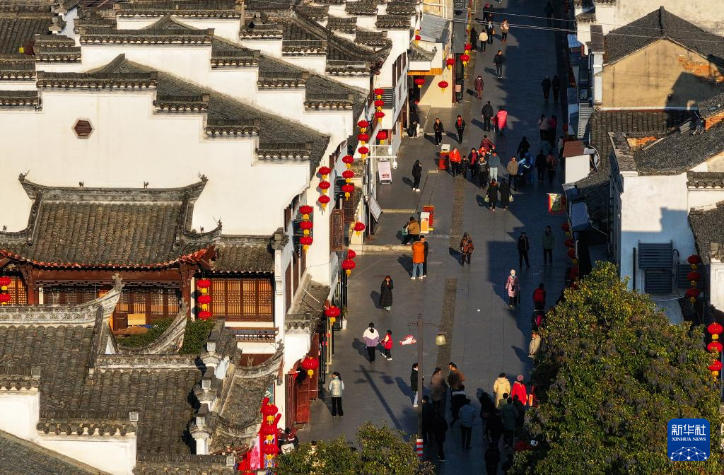 春节临近,安徽省黄山市歙县徽州古城挂起串串大红灯笼,洋溢着喜庆红火的节日氛围。