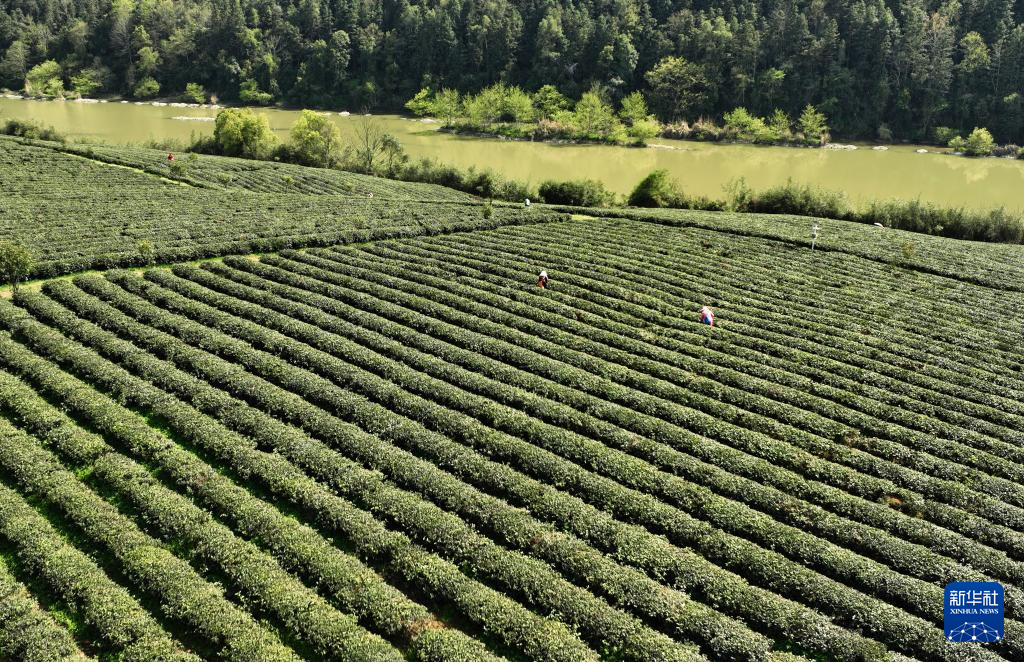 江西省修水县漫江乡的宁红茶制茶基地茶园中,茶农在采摘鲜叶(3月28日摄,无人机照片)。