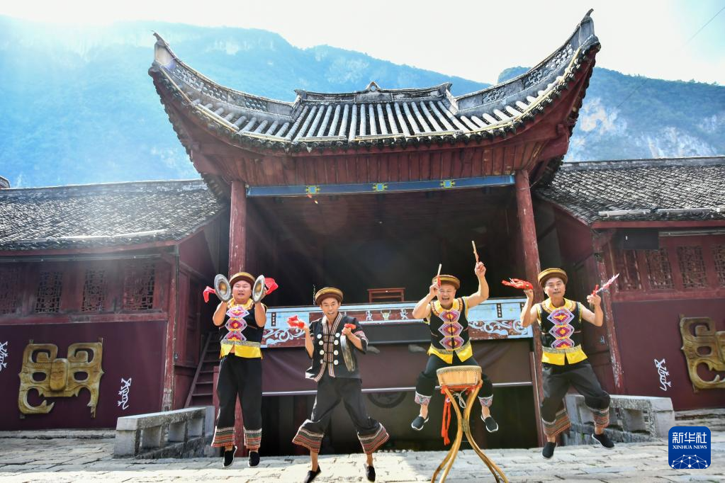 9月13日,在重庆市酉阳土家族苗族自治县龚滩古镇,非遗传承人李明(右二)和班子在排练中秋演出的节目——非遗“酉阳耍锣鼓”。
