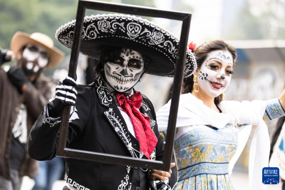 这是11月2日在墨西哥首都墨西哥城拍摄的亡灵节游行现场。