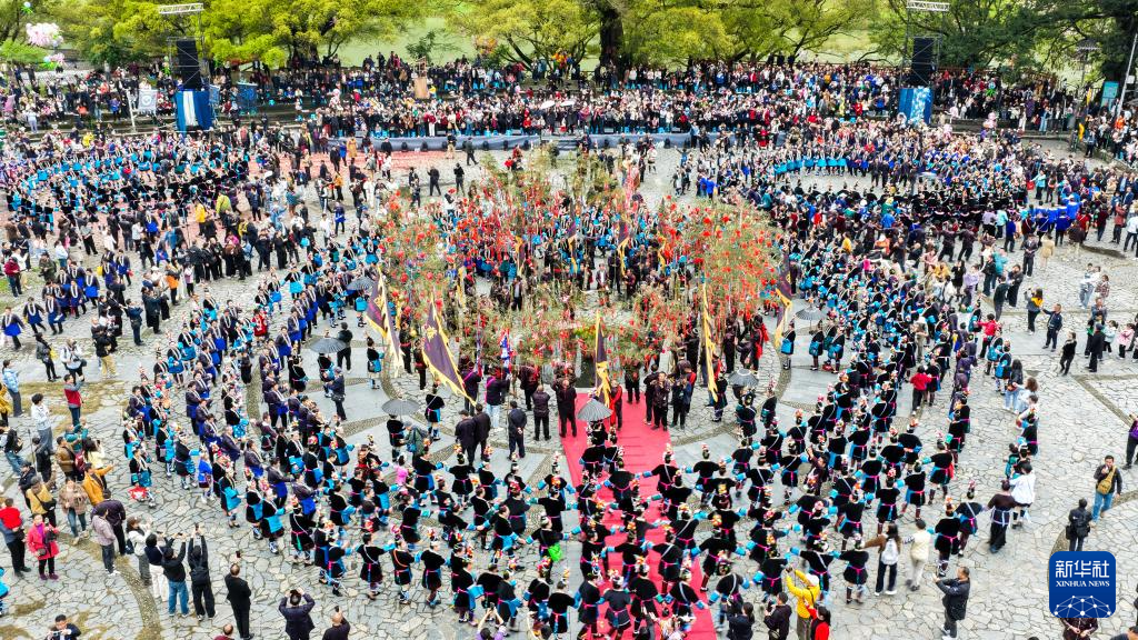 3月28日,在贵州省榕江县三宝侗寨,侗族群众跳千人多耶舞欢庆“萨玛节”(无人机照片)。