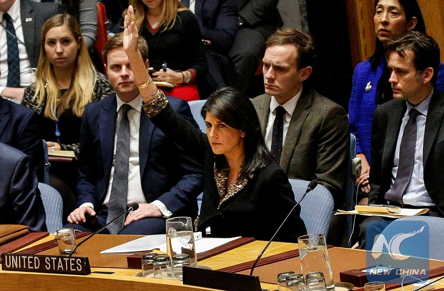 U.S. Ambassador to the United Nations Nikki Haley vetos an Egyptian-drafted resolution regarding recent decisions concerning the status of Jerusalem, during the United Nations Security Council meeting on the situation in the Middle East, including Palestine, at U.N. Headquarters in New York City, New York, U.S., December 18, 2017. (Reuters Photo)