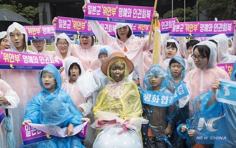 People attend an anti-Japan protest with a statue of "comfort women" in Seoul, South Korea, Aug. 15, 2017. (Xinhua/Lee Sang-ho)