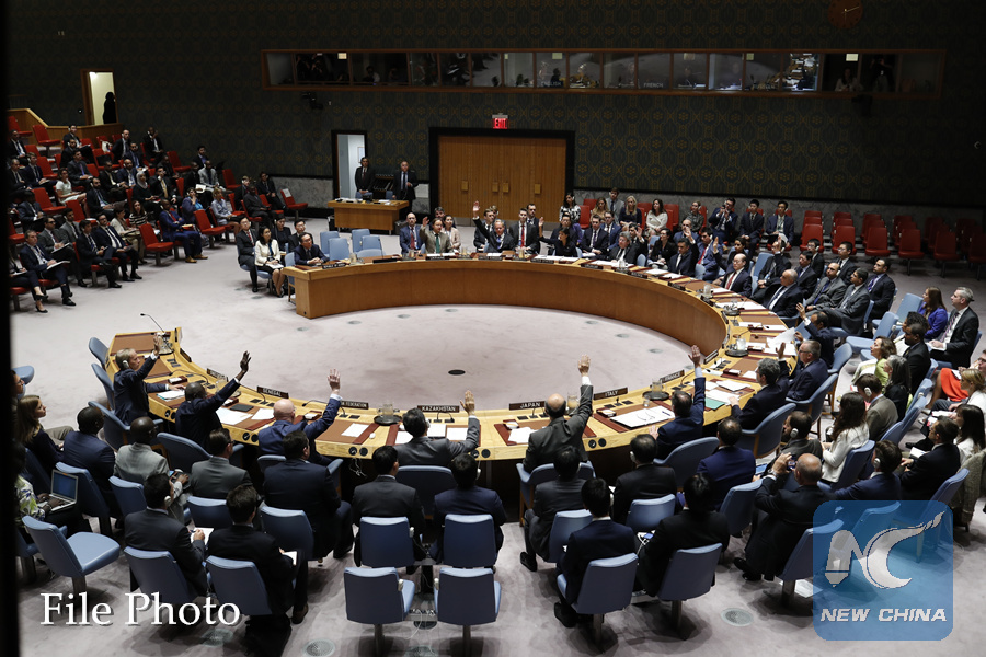 Photo taken on Sept. 11, 2017 shows the United Nations Security Council voting on a resolution on the Democratic People's Republic of Korea (DPRK) at the UN headquarters in New York. (Xinhua/Li Muzi)
