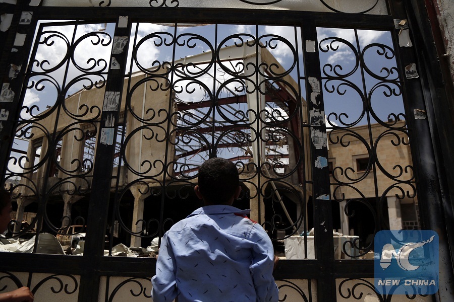 A boy stands in front of a building destroyed in airstrikes in Sanaa, Yemen, on Sept. 5, 2018. (Xinhua/Mohammed Mohammed)