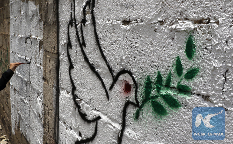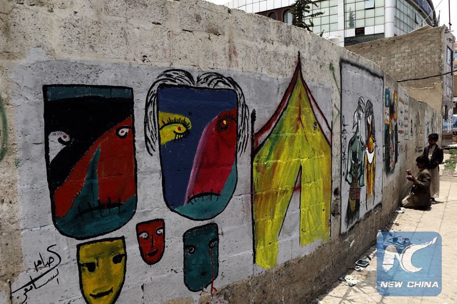 "Violence against the Yemeni women and children has been increasing in the war," Mubarak told Xinhua. "I'm drawing graffiti today to depict the social, economic and mental pains of women and children at war."