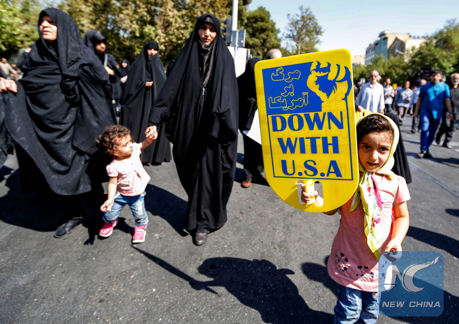 Iranians raise anti-U.S. signs and chant slogans as they march during a demonstration following the weekly Muslim Friday prayer in the capital Tehran on Sept. 28, 2018. (AFP photo)