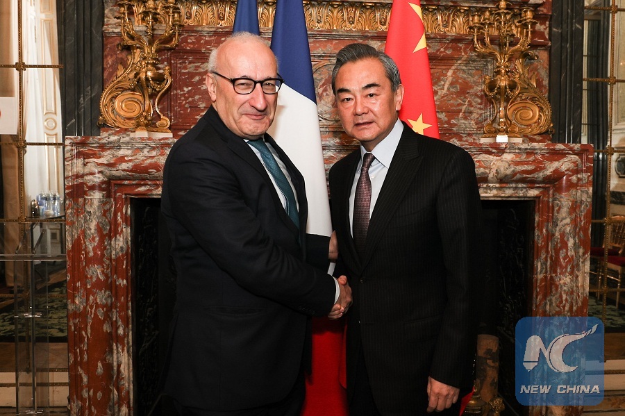 Chinese State Councilor and Foreign Minister Wang Yi (R), who is currently in France for the 18th consultation of the coordinators for the China-France Strategic Dialogue, meets with Philippe Etienne, diplomatic adviser to the French President at the Elysee Palace, in Paris, France, Jan. 24, 2019. (Xinhua/Zheng Huansong)