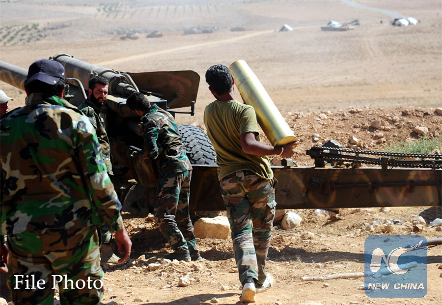 Syrian soldiers prepare artillery to fire at positions of the Islamic State (IS) group in Syria's Qalamoun region, on Aug. 26, 2017. (Xinhua/Ammar Safarjalani)