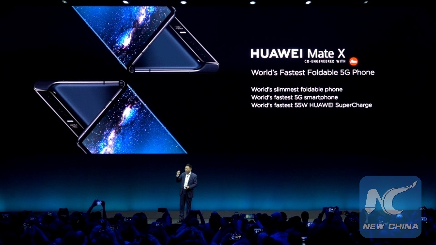 Richard Yu, CEO of Consumer Business Group of Chinese tech company Huawei, presents the new Mate X, a foldable 5G ready smartphone, ahead of the Mobile World Congress in Barcelona, Spain, Feb. 24, 2019. (Xinhua)