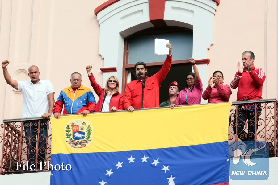 Image provided byVenezuela's Presidency shows Venezuelan President Nicolas Maduro (C) taking part in a rally in support of his government, at the Miraflores Palace, in Caracas, Venezuela, on Jan. 23, 2019. (Xinhua/Venezuela's Presidency)