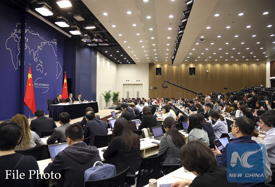 Chinese State Councilor and Foreign Minister Wang Yi speaks in a press briefing for the second Belt and Road Forum for International Cooperation (BRF) in Beijing, capital of China, April 19, 2019. (Xinhua/Yin Gang)